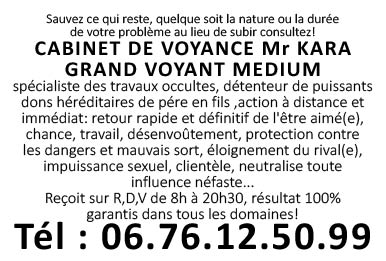 | Dans les situations graves je suis votre derniers recours! Sauvez ce qui reste, quelque soit la nature ou la durée de votre problème au lieu de subir consultez! CABINET DE VOYANCE Mr KARA GRAND VOYANT MEDIUM ASTROLOGUE MARABOUT spécialiste des travaux occultes, détenteur de puissants dons héréditaires de pére en fils ,action à distance et immédiat: retour rapide et définitif de l'être aimé(e), chance, travail, désenvoûtement, protection contre les dangers et mauvais sort, éloignement du rival(e), impuissance sexuel, clientèle, neutralise toute influence néfaste... Reçoit sur R,D,V de 8h à 20h30, résultat 100% garantis dans tous les domaines! DEPLACEMENT POSSIBLE OU PAR CORRESPONDANCE DANS TOUTE LA FRANCE Je m'engage à vous apportez mon aide de prés ou de loin quelles que soient vos besoins! Tél : 06.76.12.50.99 | |